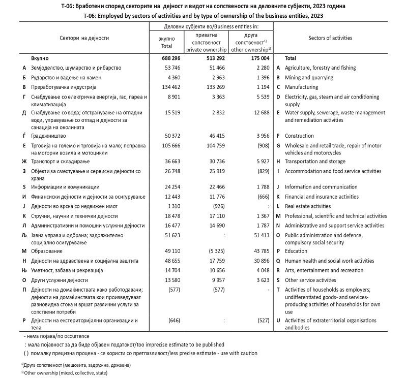 Ако се разгледаат податоците за вработените според секторите на дејност и видот на сопственоста, може лесно да се забележи дека најголем број од вработените во Македонија работат во преработувачката индустрија (134.462 лица), каде што доминира приватната сопственост, а на второто место е трговијата на мало и големо, поправка на моторни возила и мотоцикли со 105.666 вработени, исто така доминантно во субјекти во приватна сопственост.