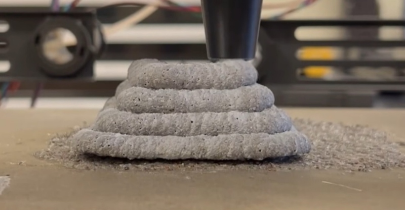 За да се елиминираат повеќекратните негативни ефекти од цементот, научниците од Орегон развиле нов материјал за 3Д-печатење. Тој се состои главно од глинеста почва збогатена со влакна од коноп, песок и биојаглен.