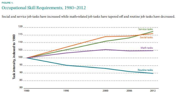 На графиконот може да се види дека задачите што вклучуваат работа со или за луѓе, што бара подобри некогнитивни вештини, се многу поважни сега отколку што биле во 80-тите и 90-тите години. Задачите што бараат социјални вештини се зголемиле за 16 и 17 отсто, додека задачите што бараат високо ниво на математика се зголемиле за само пет отсто.