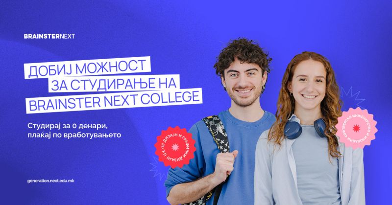 Првиот акредитиран практичен ИТ-факултет Бреинстер Некст колеџ и оваа година ќе овозможи студии без никакви трошоци сѐ до вработувањето за кандидатите што ќе се запишат на додипломските студиски програми преку уникатната и единствена поволност за студиско финансирање „Студирај сега, плаќај по вработувањето“.
