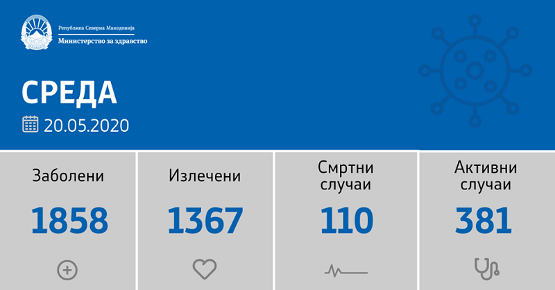 Вкупната бројка на ковид-дијагностицирани во нашата земја од почетокот на епидемијата изнесува 1.858 од кои оздравени пациенти се 1.367, починале 110, а во моментов бројот на активни случаи во земјата изнесува 381 пациент.