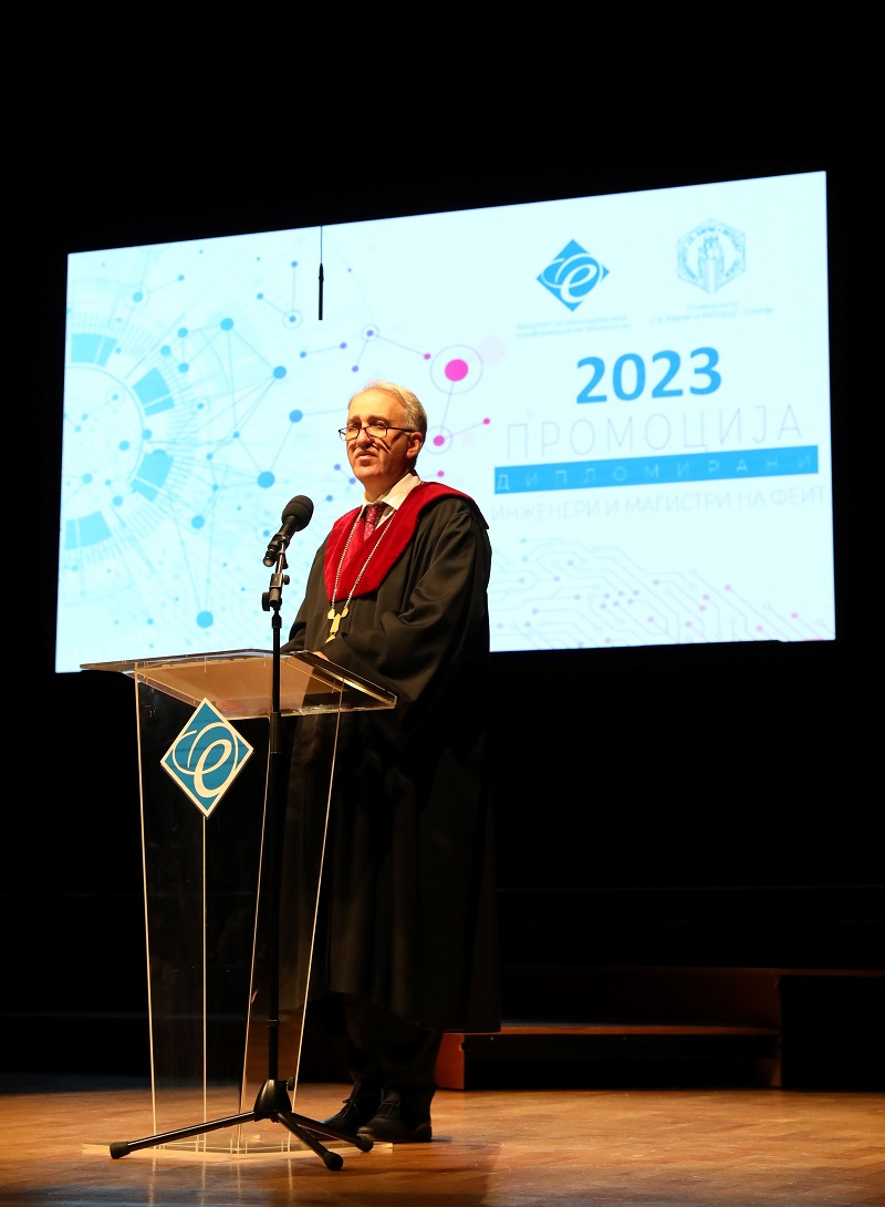 Деканот на Факултетот за електротехника и информациски технологии проф. д-р Димитар Ташковски ги повика новодипломираните инженери и магистри да бидат храбри да го употребат знаењето, технологиите и вештините кои ги стекнаа на ФЕИТ.