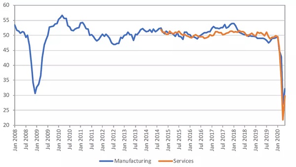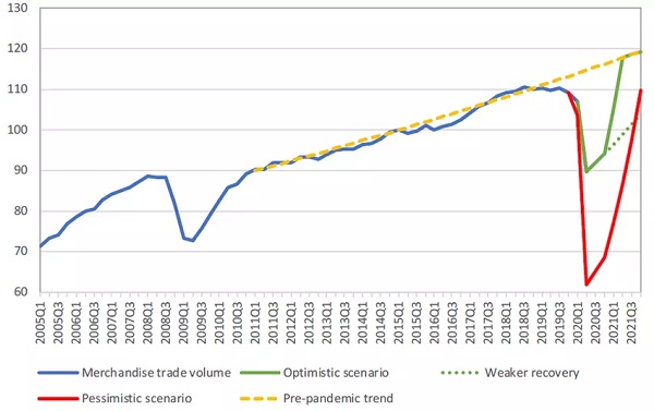организација, овие падови се историски големи, но можеле да бидат полоши. Според прогноза на организацијата, трговската размена можела да падне до 32% во април во најлошо сценарио. Сепак, постојат ризици за обемот во следните месеци, особено во случај на втор бран, послаб економски раст и трговски ограничувања што би ги вовеле владите.