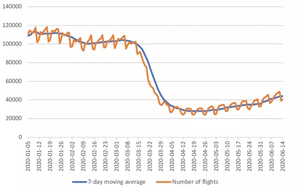 Бројот на летови се намалил за 74% од 5 јануари до 18 април, но сепак се зголемил оттогаш. Овие зголемувања се во однос на историски ниски падови, но индустријата се подобрува.