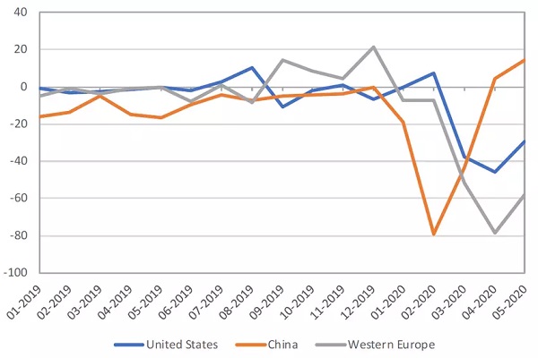 Продажбата на автомобили покажува знаци на подобрување. Продажбата на автомобили во Кина се намалила за речиси 80% во февруари во споредба со истиот месец минатата година, но пораснала за 5% во мај. Се забележува подобрување и во Западна Европа и САД во мај.