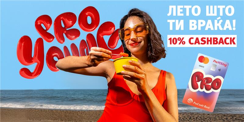 Сè уште можете да го искористите летото до максимум! ПроКредит Банка нуди 10% cashback на сите трансакции направени со ProYOUng дебитната картичка за млади – без разлика дали плаќањата се онлајн или на ПОС-терминал, во земјата или во странство.
