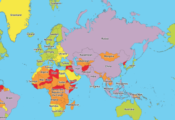 Венецуела, Хаити, Северна Кореја, Сирија, Ирак, Авганистан, Јемен, Еритреја, Буркина Фасо, Нигер, Гвинеја, Сиера Леоне, Либерија, Гвинеја Бисао и Бурунди постигнале „многу висок“ ризик за патување.