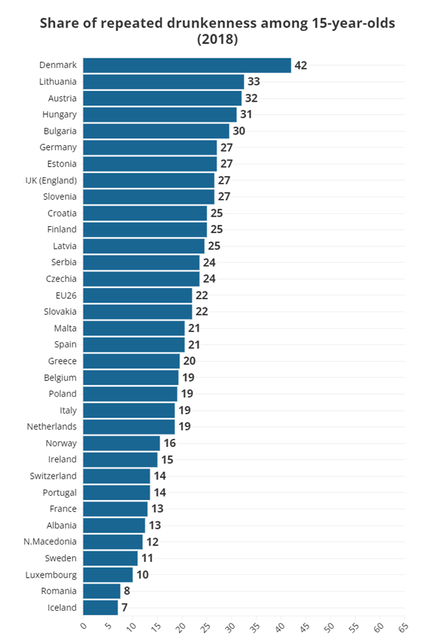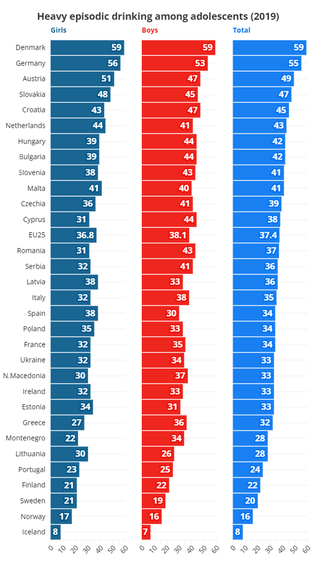 На дното на листата се Исланд, Норвешка, Шведска и Финска, каде што најмал процент од адолесцентите прекумерно пијат алкохол. На врвот се Данска, Германија, Австрија, Словачка и Хрватска.