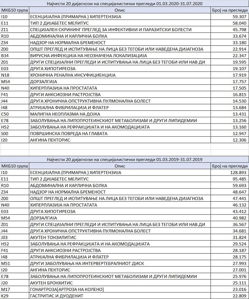 За 20. најчести дијагнози кога се одело на преглед кај специјалист во последните месеци (освен поради коронавирус), откако во земјава се шири коронавирусот, вкупно биле направени 477.272 прегледи, за разлика од лани кога за истиот период биле извршени 851.549 прегледи.