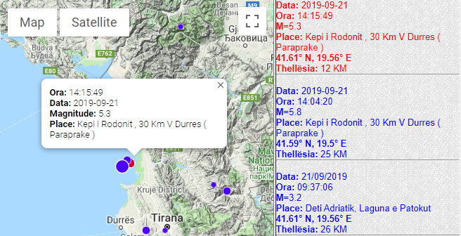 Првиот земјотрес е регистриран во 16:04 часот по локално време со магнитуда од 5.8 по Рихтер и епицентар во Јадранско Море на длабочина од десет километри, на шест километри од Драч и 34 километри од Тирана. Вториот земјотрес бил во 16:15 со магнитуда од 5.5 по Рихтер со епицентар на длабочина од три километри и на седум километри од Драч.