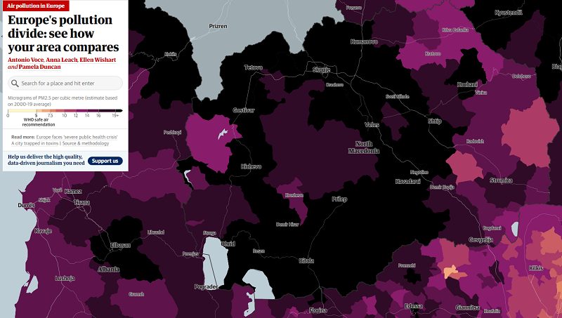 Околу 98 отсто од европските граѓани дишат отровен, многу штетен загаден воздух, кој е поврзан со околу 400.000 смртни случаи годишно, а Македонија е најтешко погодена, покажа истражувањето на британскиот дневен весник „Гардијан“.