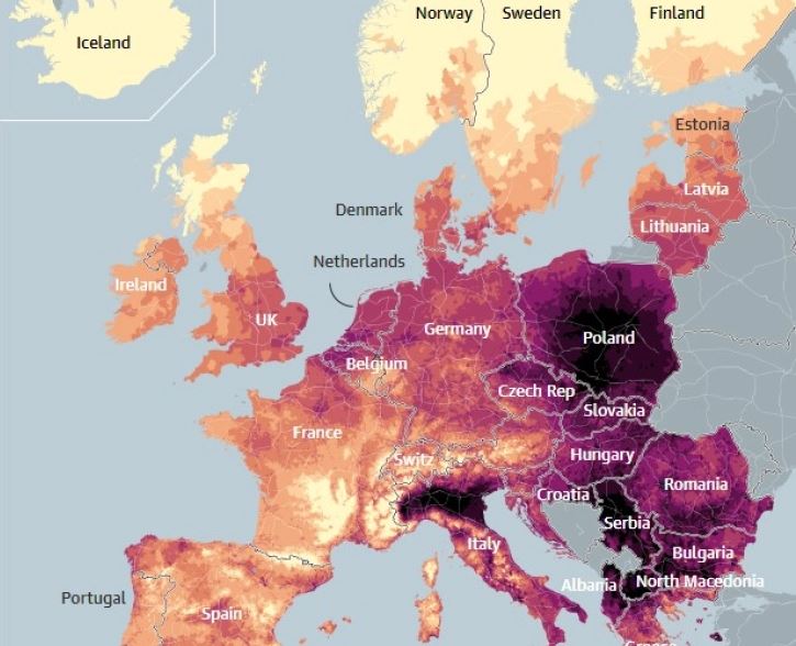 Источна Европа е значително полоша од Западна Европа, освен Италија, каде што повеќе од една третина од оние што живеат во долината и околните области на северот на земјата дишат воздух што е четири пати над насоките на СЗО за најопасните честички во воздухот.