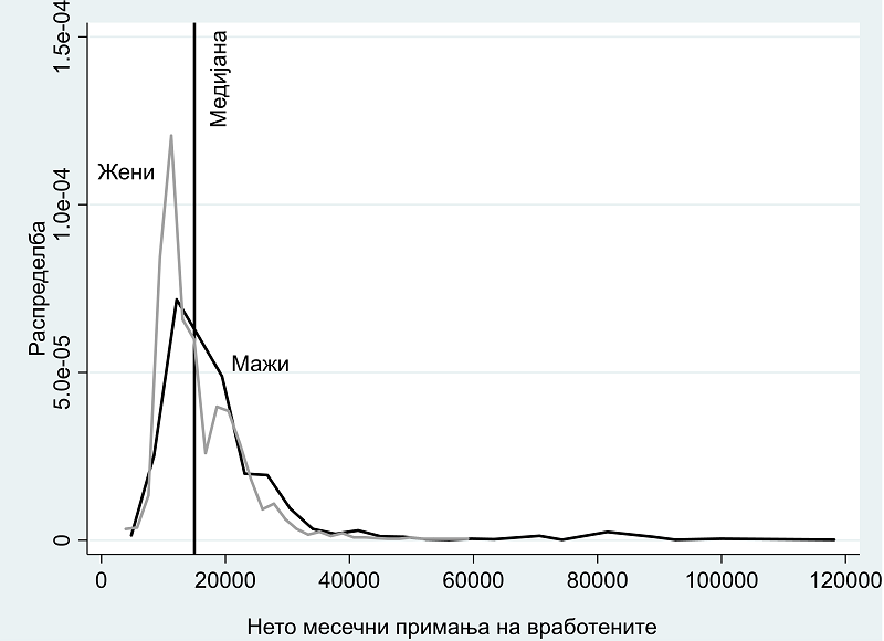 Со помош на податоците од Анкетата за приходите и условите на живеење се утврдува медијалната плата како просечна вредност. Оттука, може да се пресмета процентот на вработени кои се ниско платени, при што како праг се земаат две третини од медијалната плата. За илустрација, на графиконот подолу е прикажана распределбата на примањата кај мажите и жените во РС Македонија за 2016 година, а истовремено означена е медијалната плата. Може да се забележи дека распределбата на примањата кај жените е поостра и се карактеризира со помала дисперзија во споредба со распределбата на примањата кај мажите. Освен тоа, распределбата на примањата кај жените е повеќе асиметрична во лево, односно значително под медијаната, што јасно укажува на постоење родов јаз во примањата. Понатаму, со помош на Логит модел може да се оцени за колку е поголема веројатноста на жените да имаат ниски примања споредено со мажите. Врз основа на резултатите може да се заклучи дека жените двојно повеќе се во ризик да бидат ниско платени2.