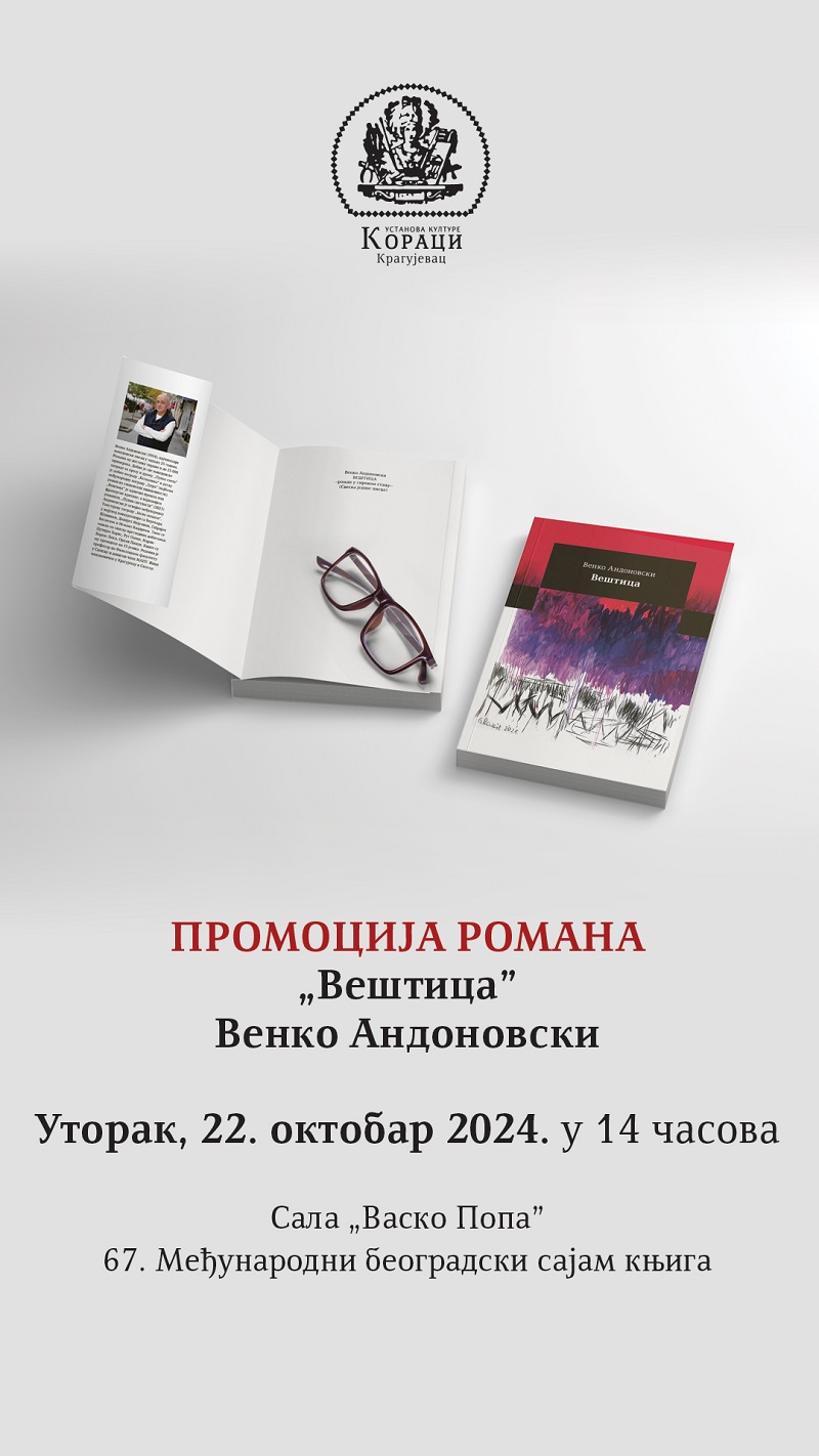 Утре, 22 октомври, во 14 часот, во салата „Васко Попа“ на Белградскиот саем на книгата, ќе се одржи промоција на српското издание на романот „Вештица“ на Венко Андоновски.