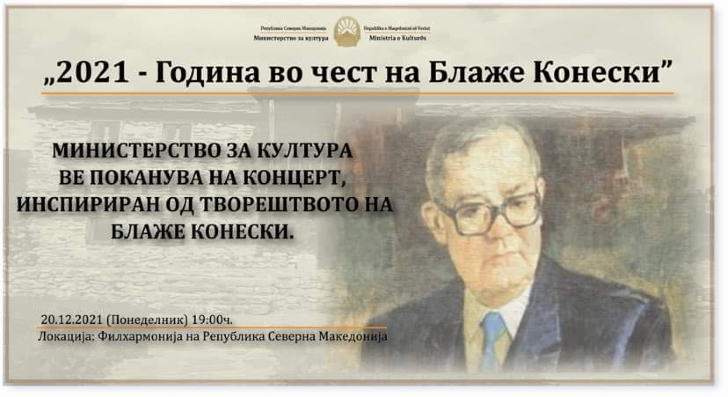 Со концерт во Филхармонијата вчера заврши манифестацијата со која беше заокружено чествувањето на „2021 – Година во чест на Блаже Конески“. Оркестарот на Филхармонијата изведе концерт инспириран од творештвото на Блаже Конески, во чии рамки беа интерпретирани делата „Молитва“ од Тодор Скаловски и „Записи“ од Томислав Зографски. Оркестрацијата беше на Ангел Спировски, баритон – Горан Начевски.