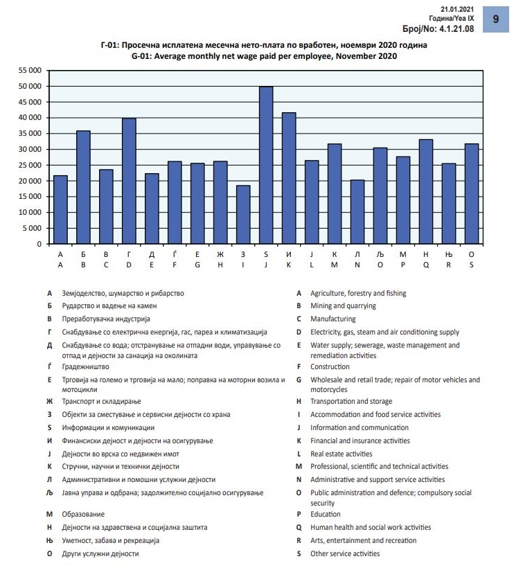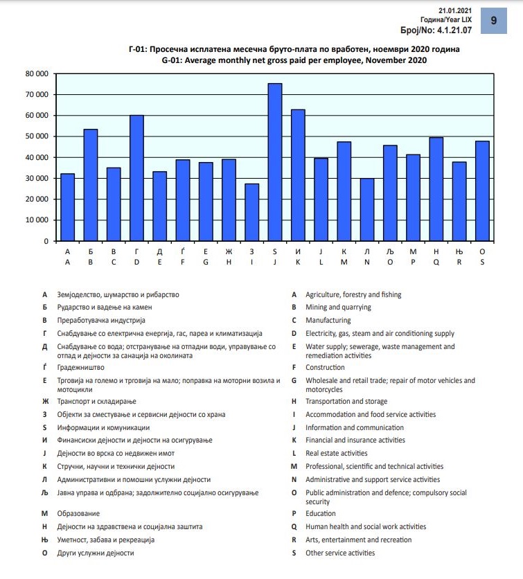 Лидери во однос на нето-платата се вработените во секторот информации и комуникации, за кој е забележано дека просечната исплатена месечна нето-плата по вработен во ноември 2020 година била 49.824 денари. Но, во овој сектор се издвојува компјутерско програмирање, консултантски и сродни дејности со просечна нето-плата за октомври во износ од 66.556 денари, додека другите се со помали примања. Во секторот образование наведено е дека во ноември просечната нето плата била 27.659 денари.