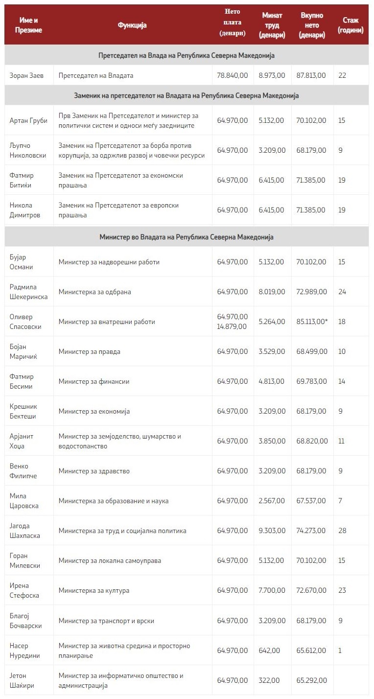 Владата ги објави платите исплатени во декември 2020 година на премиерот, неговите заменици и министрите. Според објавеното, најголема плата зема премиерот Зоран Заев (87.813 денари), а на второто место е министерот за внатрешни работи Оливер Спасовски со 85.113 денари вкупна нето плата. На третото место се најде министерката за труд и социјална политика Јагода Шахпаска со 74.273 денари.