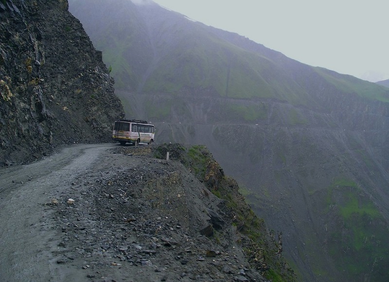 Овој пат од 9 километри, кој се протега низ Хималаите во Северна Индија, не е за сите. Прашливиот и неасфалтиран пат достигнува висина од 3.528 метри и е доволно широк да прими мали автомобили. Но, тоа не ги спречува големите автобуси и камиони да минуваат по должината на единствениот премин меѓу Кашмир и Ладех.