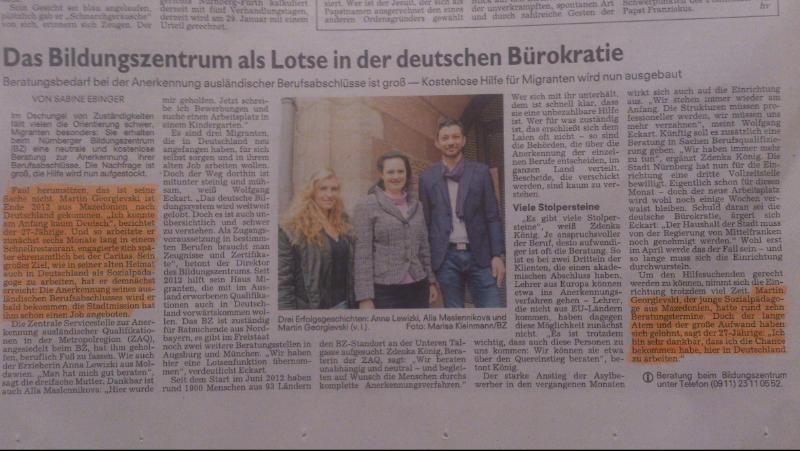 - Тука најпрво почнав со интензивно изучување на германскиот јазик, што беше голем предизвик, но не ми претставуваше некој проблем со оглед на огромната мотивација, како и претходното познавање на 6 странски јазици. Паралелно со изучувањето на германскиот јазик работев 6 месеци во „Мекдоналдс“, колку да имам сопствени примања, додека да најдам работа по струка. Веќе по завршувањето на Б2 ниво, започнав да работам како педагог во еден дом за лица со психички проблеми, што беше приближно до мојата струка како социјален работник. Но, набрзо сфатив дека за да најдам работа по мојата квалификација, неопходно ми е признавање на дипломата од Скопје. Постапката за признавање на стекнатата диплома ја започнав во истата институција за која работам сега. Тогаш целиот проект беше на почеток, со само едно стручно вработено лице задолжено за цела Франконија (Franken - област во Баварија со околу 1 милион жители. Од поголемите градови тука спаѓаат Нирнберг, Вирцбург, Ерланген итн.). Само колку за споредба, денес сме 15 вработени - вака ја почна својата приказна Мартин.