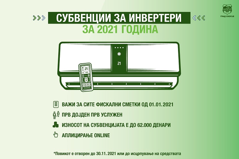 Град Скопје го објави јавниот повик за доделување субвенции за купување инвертер-клими во 2021 година. Аплицирањето ќе се врши онлајн, а на повикот може да се пријават лица кои ги исполнуваат предвидените услови и оние што набавиле инвертер-клима почнувајќи од 1.1.2021 година и се жители на Град Скопје (општини Гази Баба, Аеродром, Кисела Вода, Карпош, Чаир, Шуто Оризари, Центар, Ѓорче Петров, Бутел и Сарај).