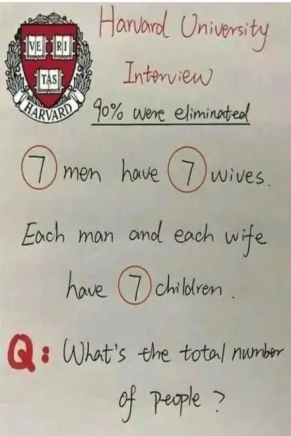 Задачата гласи вака: „Седум мажи имаат седум жени. Секој маж и секоја жена имаат седум деца. Колку луѓе се тоа?