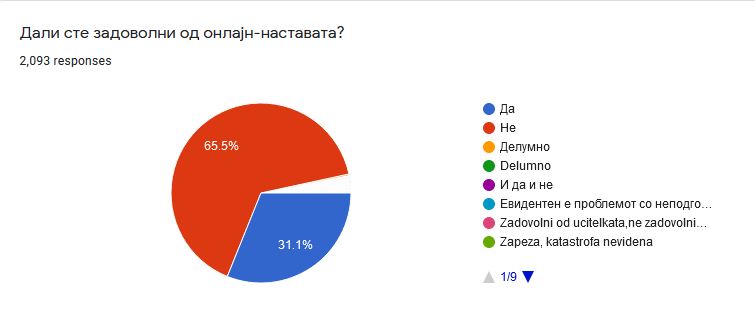 На прашањето „Дали сте задоволни од онлајн-наставата?“ одговориле вкупно 2.093 испитаници, од кои повеќе од половина или 1.371, односно 66,5 отсто дале негативен одговор. Потврден одговор, пак, дале 651 испитаник, или 31,1 отсто. Останатите проценти им припаѓаат на оние што не одговориле прецизно, односно посочиле дека делумно се задоволни, дека не се ниту задоволни ниту незадоволни, или, пак, одговориле и со да и со не.