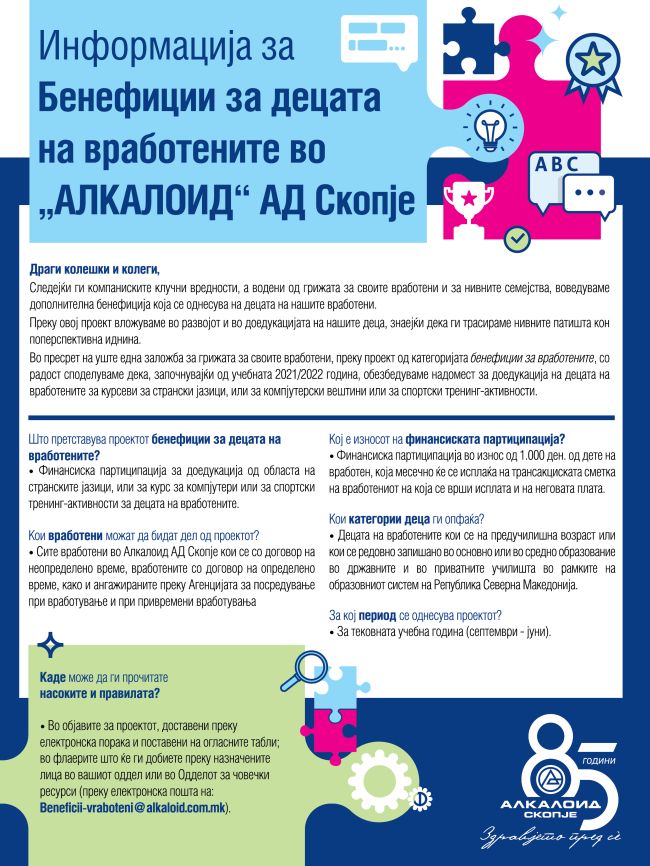 Најновиот проект на „Алкалоид“ АД Скопје вклучува бенефиции за децата на вработените, преку финансиска партиципација на компанијата во износ од 1.000 денари од дете на вработен на месечно ниво, наменети за доедукација од областа на странските јазици, курсевите за компјутери, спортските и рекреативните активности, како и на активностите од областа на науката и на културата, во текот на целата учебна година. Во проектот се опфатени деца од сите категории на вработените во „Алкалоид“ АД Скопје – деца од предучилишна возраст и оние што се редовно запишани во основно и во средно училиште.