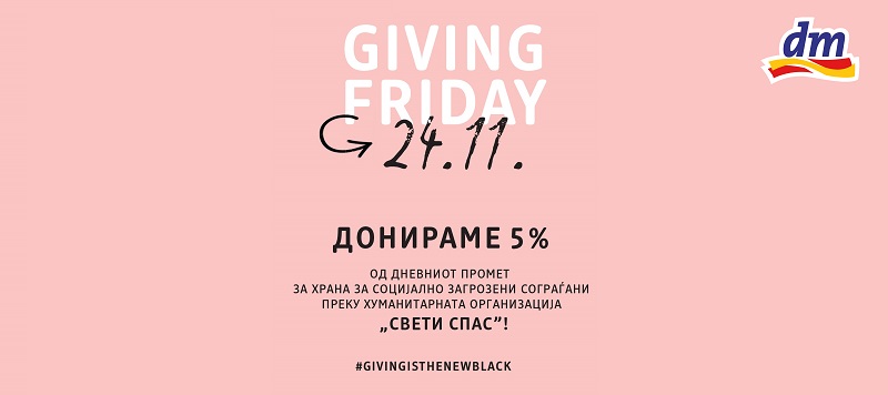 Под мотото GIVING IS THE NEW BLACK, најголемиот дрогериски синџир во земјава, на 24 ноември ќе одвои 5% од вкупниот дневен промет од сите дрогерии во хуманитарни цели, за набавка на пакети храна за социјално загрозени сограѓани. Оваа година донацијата ќе биде реализирана преку хуманитарната организација „Свети Спас“!