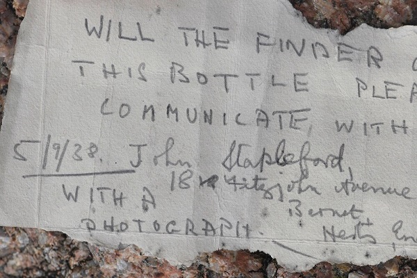 Пораката ја пронашол Најџел Хил, кој го шетал своето куче на плажата. Тој морал да го скрши шишето за да ја прочита пораката. Успеал да стигне до дамата што сега живее на адресата оставена во шишето. Таа открила дека Џон Стејплфорд ја купил куќата во 1921 година.