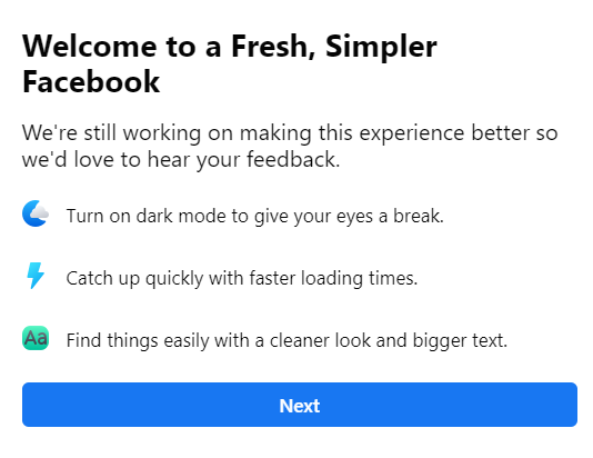 Потоа ќе ви се појави порака за добредојде на новиот, поедноставен „Фејсбук“ и тука само треба да кликнете на „Next“.