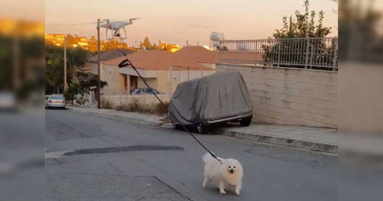 Еден човек од Кипар решил да го искористи својот дрон за да провери дали неговиот миленик, кучето, може да се движи без тој да го шета. Тој го закачил ременот на кучето за дронот подалеку од перките за да не се заплеткаат и почнал да го шета миленикот од далечина. Сепак, на снимката може да се види дека кучето го диктира шетањето (а и некој снима и оди пред него, така што не сме сигурни колкава е таа далечина).