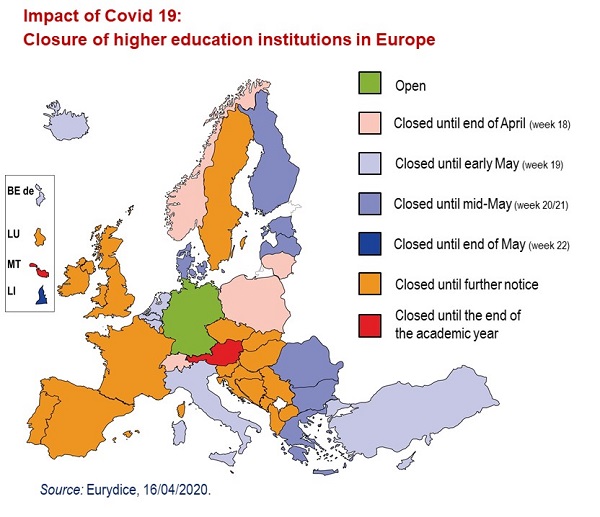 Според плановите, Лихтенштајн ќе остане со затворени факултети до крајот на мај, а Австрија не планира да ги отвори до крајот на учебната година. Сите други земји во Европа, меѓу кои и Македонија, Шпанија, Франција, Велика Британија и Шведска, ги затворија факултетите без притоа да посочат одреден датум за повторно отворање.