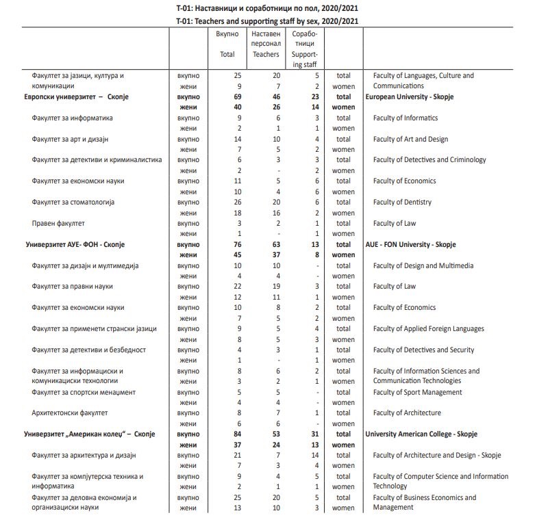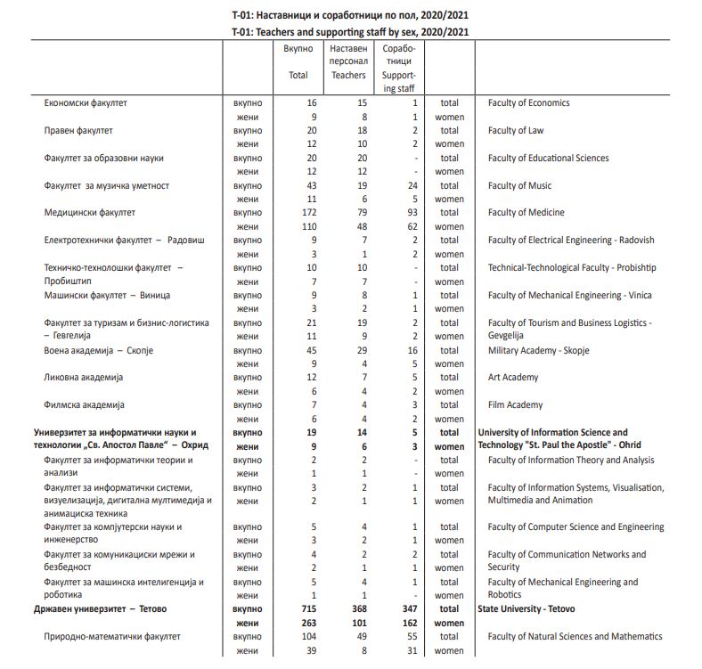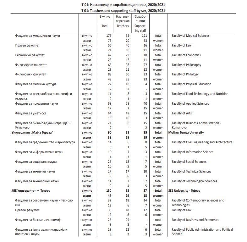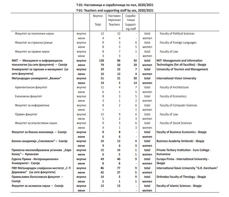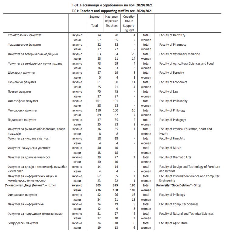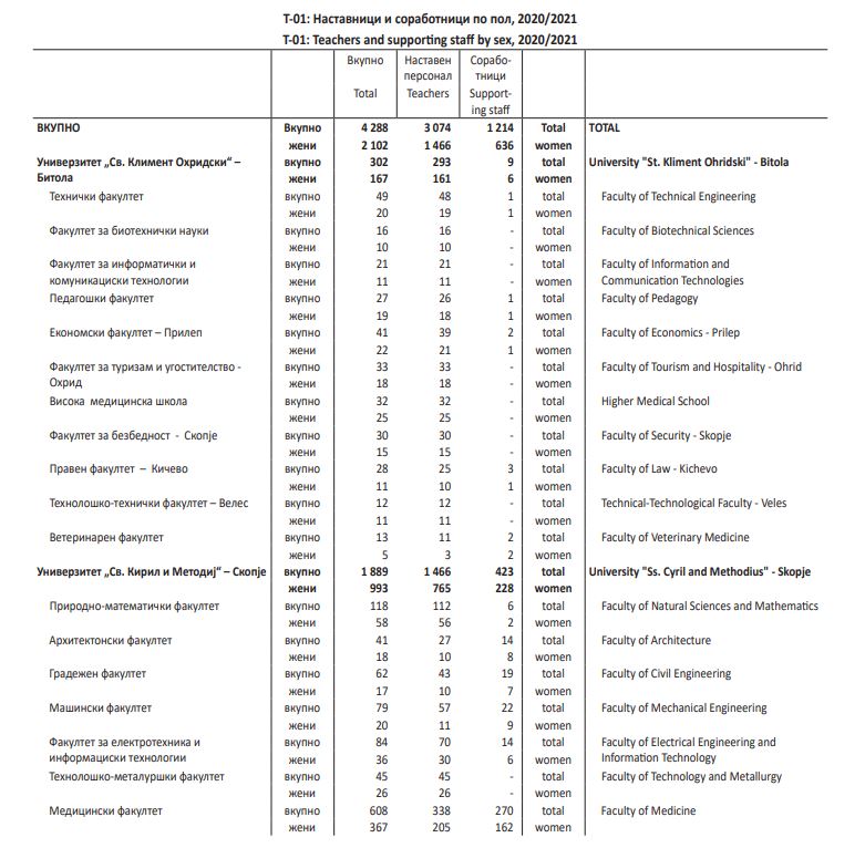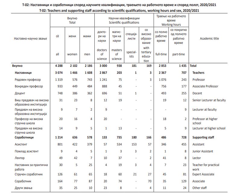 Бројот на наставнички и соработнички во учебната 2020/2021 година изнесува 2.102 или 49%.