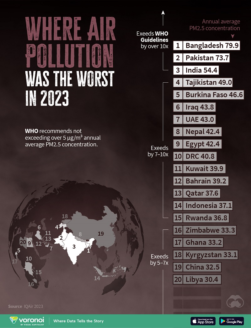 Ова се најзагадените земји според IQAir, рангирани според годишната просечна концентрација на ПМ 2,5 честички во 2023 година во микрограми на кубен метар.