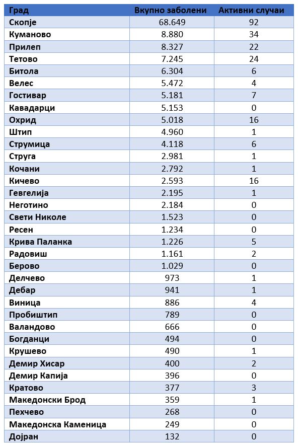 Во табелата во продолжение можете да видите по колку активни случаи има и во другите градови.