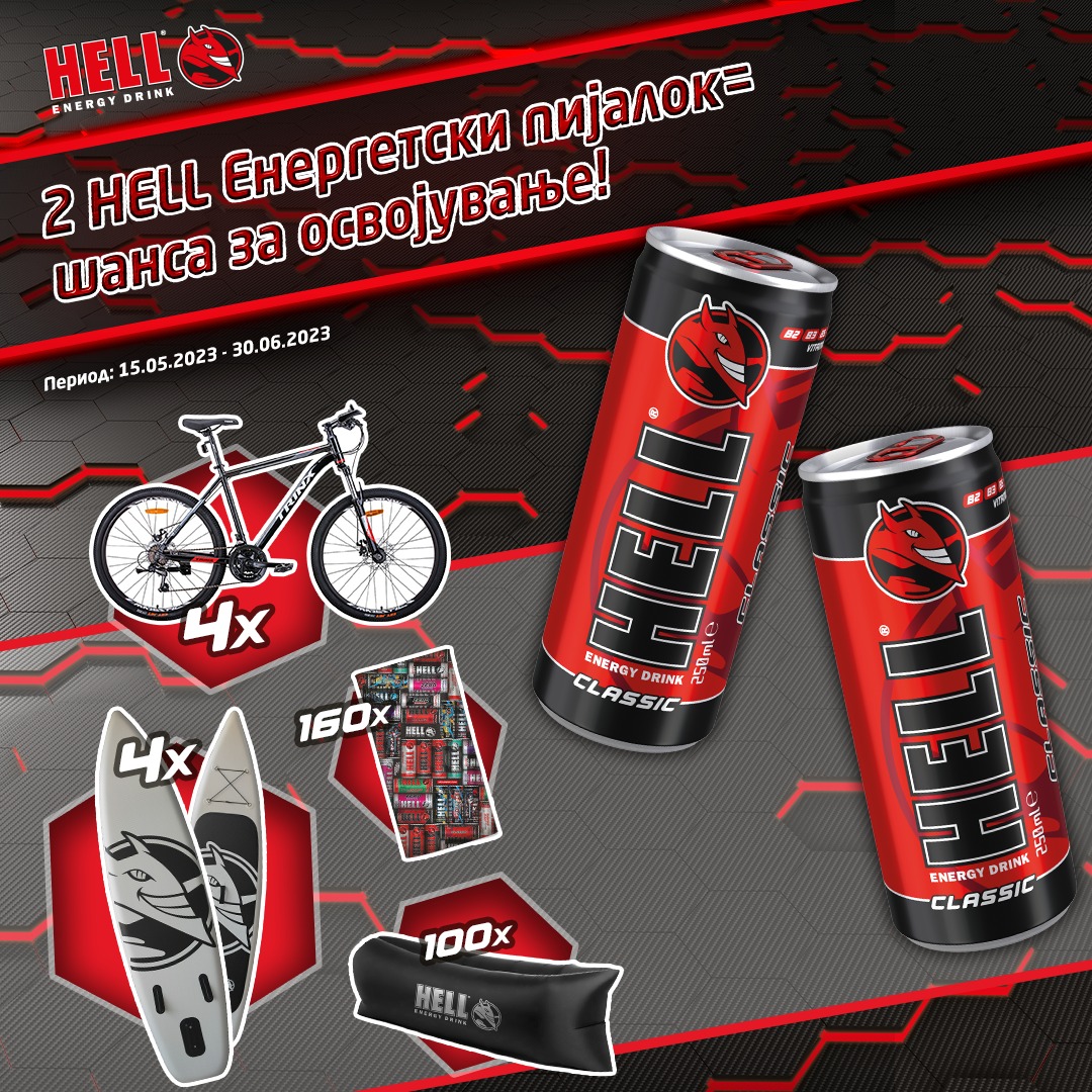 Купете 2 лименки од HELL ENERGY DRINK на една фискална сметка. Регистрирајте ја сметката со фотографија, број, име и мобилен телефон на hellenergypromo.mk и бидете во игра за големи награди: 4 paddle даски, 4 велосипеди, 100 душеци за надувување и 160 пешкири за на плажа.
