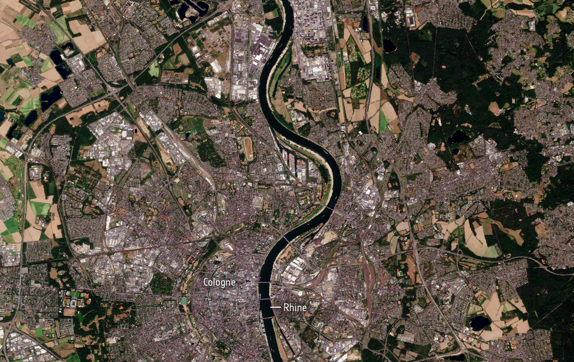 Сателитот „Коперникус Сентинел-2“ направил фотографии од дел од реката во близина на Келн. Се забележува огромна разлика помеѓу состојбата на реката минатиот август и сега.