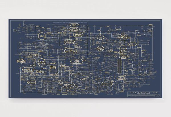 рокенролот. Меѓу нив се изведувачи како Лид Бејли, Литл Ричард и Елвис. Вклучени се и светски познати брендови како „Битлси“, „Ролинг стоунс“, „Бич бојс“, како и современи рок-изведувачи: „Вајт Страјпс“ и „Арктик манкис“. Дополнително, постерот слави некои од најголемите места што ги инспирирале музичарите, како и дизајнерите што играле улога во естетиката на жанрот.