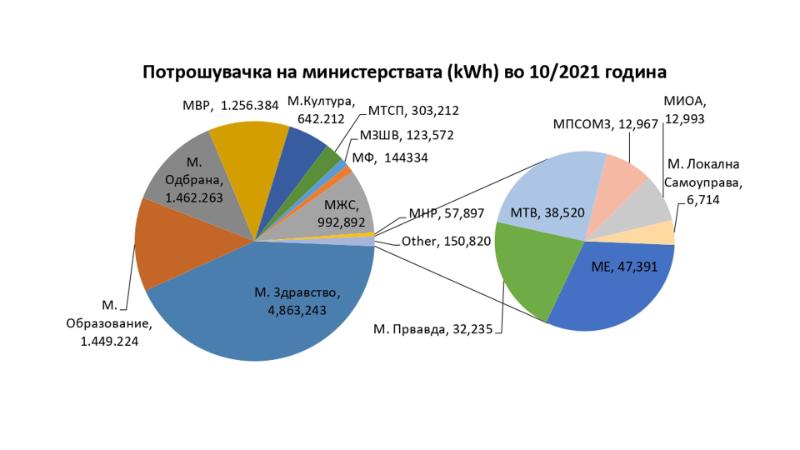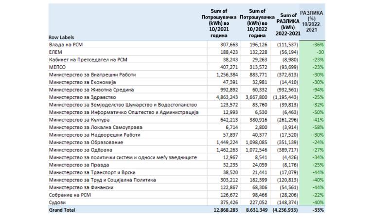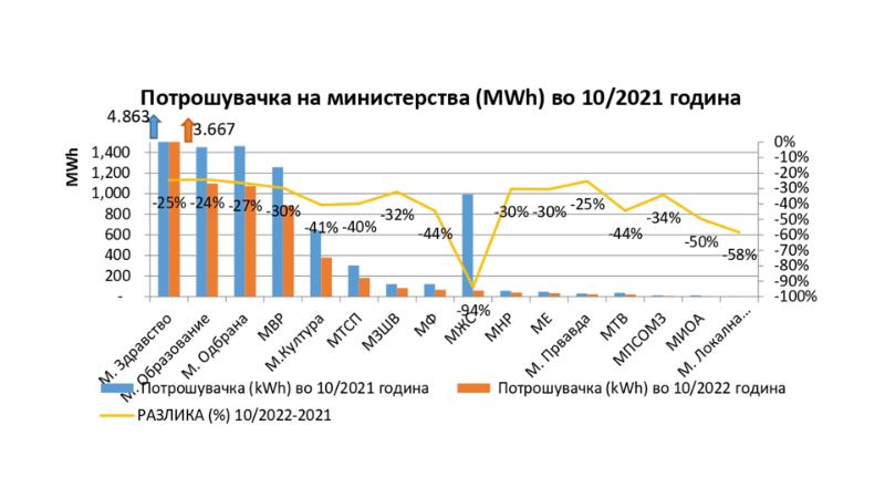 Бектеши истакна дека сите институции во октомври имале најмалку 15 отсто помала потрошувачка на електрична енергија, а најголема заштеда имало во зградата на МОН - до 58%. Најмала била заштедата кај Министерството за здравство (18%), заштедата во Владата е 32%, во Собранието е 22%, во Кабинетот на претседателот 24%, во административната зграда на ЕСМ е 25% и во МЕПСО 22%.