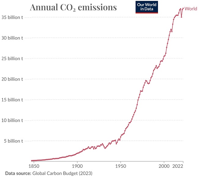 Но ајде да ја погледнеме фактичката состојба. Како што се гледа на дијаграмот на сликата подолу, трендот на зголемување на емисиите на СО2 постојано се зголемува и покрај напорите на меѓународните и националните тела.