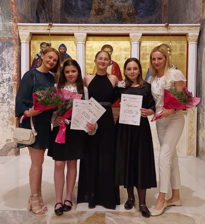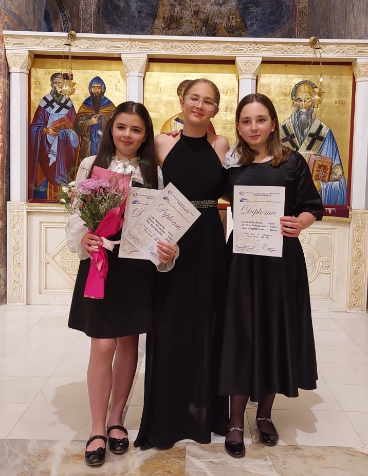 Антица Николоска (виолина) од класата на проф. Мухамед Бајрам и Ана Кузманоска (пијано) од класата на проф. Ана Ѓоргиоска, освои ПРВА награда и настапи на завршниот концерт во црквата „Св. Софија“, на кој учество земаат најдобрите од сите категории. На овој концерт беа доделени и специјални награди, а една од нив е рецитал на фестивалот „Златна Лира“, која отиде токму во рацете на нашите претставнички.