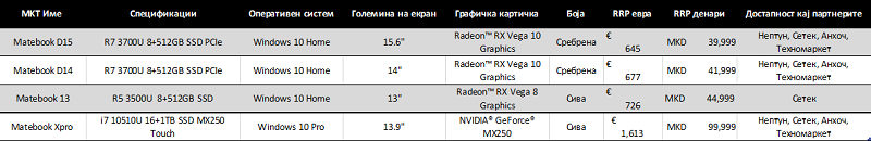 Од 25 август на македонскиот пазар станува достапна нова категорија паметни производи на технолошкиот гигант „Хуавеј“ – лесните и преносни лаптопи од серијата Matebook. На македонските корисници на располагање ќе им бидат 4 претставници од оваа серија - моделите Matebook X Pro со 13,9-инчен дисплеј на допир, потоа ултратенкиот 13-инчен Matebook 13 и елегантните машини од средниот ценовен опсег - Matebook D14 и D15.