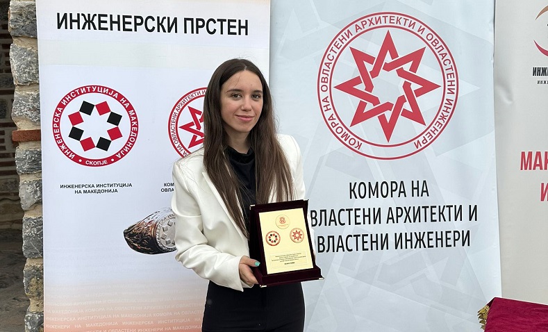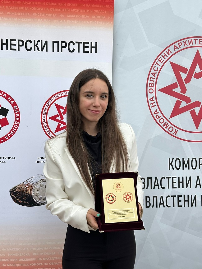 Бојана Тасева, дипломец на Факултетот по информатика на Универзитетот „Гоце Делчев“ во Штип, беше дел од 14 завршени студенти на кои претседателката Гордана Сиљановска-Давкова им додели признанија „Инженерски прстен“ за најуспешни студенти во инженерските факултети.