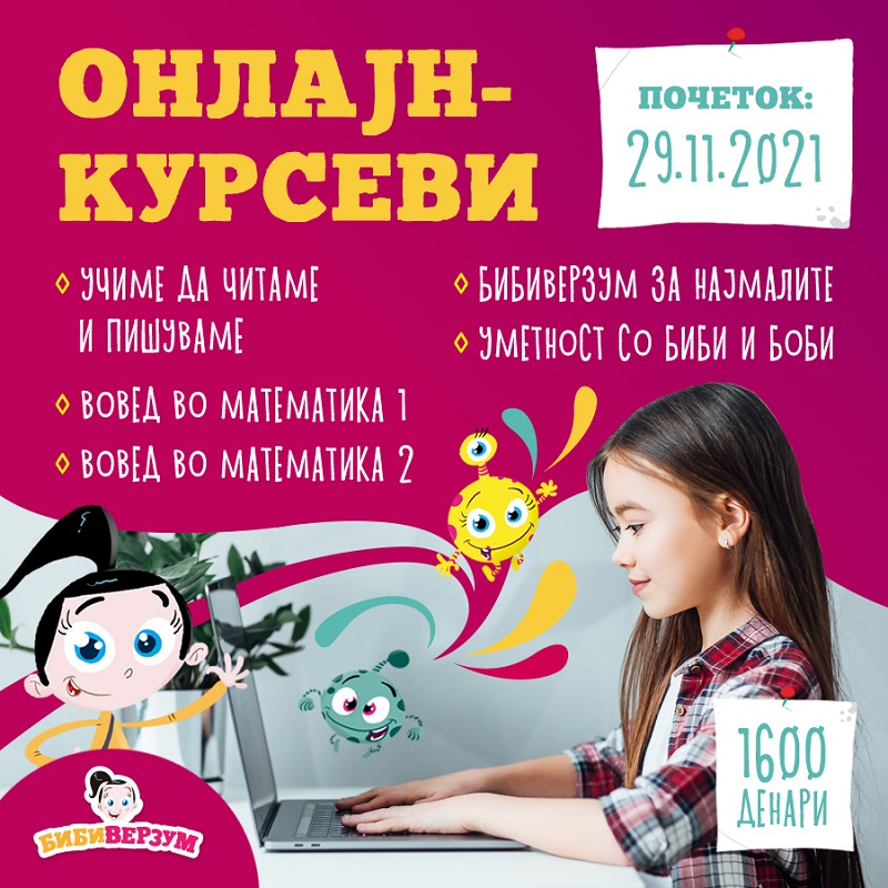 „Светот на Биби“ во рамките на едукативниот центар „Бибиверзум“ започнува со нов циклус на кратките онлајн-курсеви: „Учиме да читаме и пишуваме“, „Вовед во математика 1“, „Вовед во математика 2“, „Бибиверзум за најмалите“ и „Уметност со Биби и Боби“. Наставата ќе започне на 29 ноември. Пријавувањето се врши преку пополнување на формата на овој линк