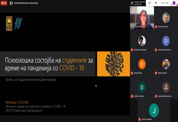Д-р Гордана Ристевска-Димитровска говореше за психолошката состојба на студентите за време на пандемијата врз основа на резултати од истражување на 244 испитаници-студенти. Констатирано е дека 1/3 од студентите имаат ниска резилиентност/отпорност, мажите се порезилиентни од жените, секој втор студент покажува знаци на трауматизација и самоизолацијата ја продлабочува депресивноста. Според професорката Димитровска, алармантен е порастот на суицидалната идејација кај студентите (еден од пет студенти) и голем дел - 40% не се задоволни од својата економска состојба, што е важно за менталното здравје и е во релација со горливиот проблем во државата со одливот на мозоци.