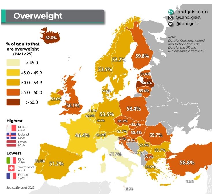 Најшокантен факт е веројатно дека во речиси секоја земја во Европа, повеќе од половина од сите возрасни луѓе се со прекумерна тежина. Во Малта (62,5%), Исланд (62,0%) и Латвија (60,4%) е дури над 60%. Единствените европски земји каде што помалку од 50% од населението е со прекумерна тежина се Италија (41,9%), Швајцарија (45,6%), Франција (46,4%), Кипар (47,9%), Црна Гора (48,1%), Холандија (48,3%) ), Белгија (48,9%) и Луксембург (49,7%). Но, да бидеме искрени, дури и резултатот на Италија од 41,9% е шокантно висок.