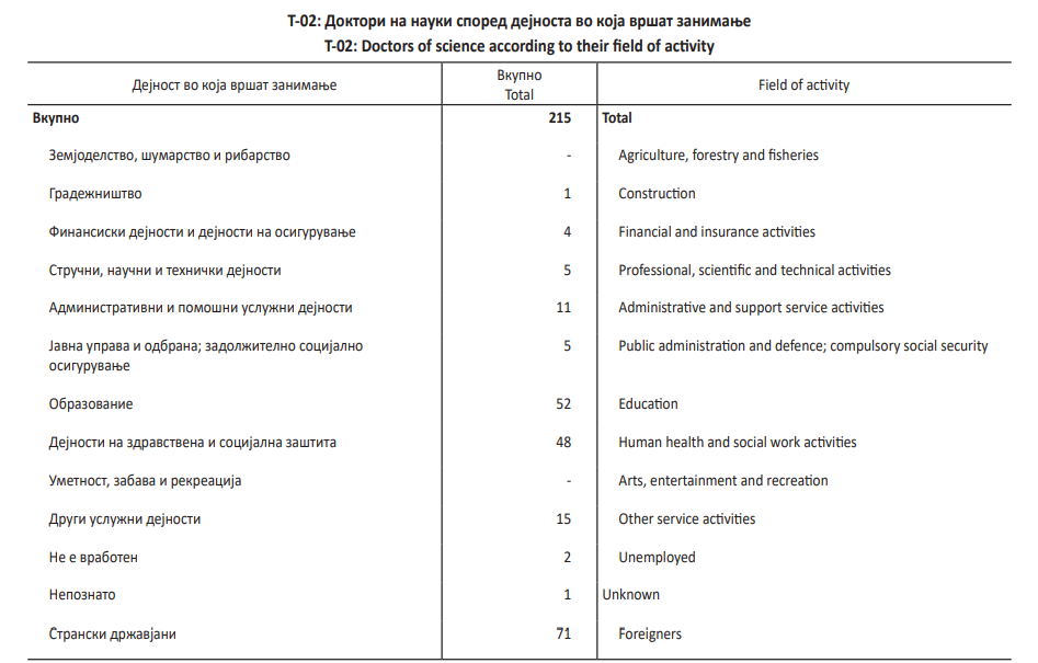 Најголем број од лицата, 22,4 отсто, докторирале во областите здравство и социјална заштита, потоа 16,7 отсто уметност и хуманистички науки, следуваат бизнис-администрација и право со 14,4 отсто, општествени науки, новинарство и информирање со 11,6 отсто, а преостанатите области се со помал процент на застапеност.