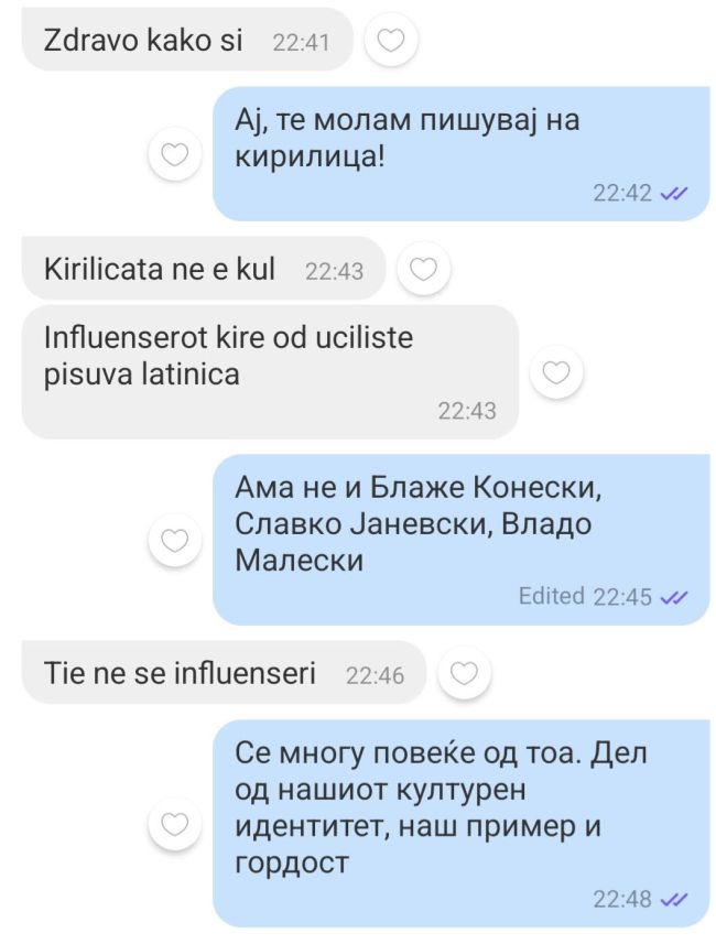 Кирилицата не е само писмо, туку е дел од македонскиот идентитет. Со секој статус и порака напишани на македонски јазик и кирилско писмо младите придонесуваат за зачувување на културниот идентитет. Во дигиталниот свет има место за кирилицата, потребно е само да ја