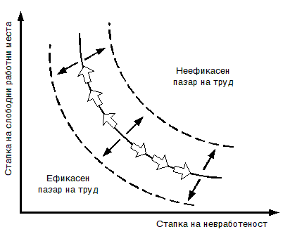 На макрониво, како аналитички инструмент за истражување на поврзувањето на работните места со работниците се користи т.н. крива на Бевериџ која го добила името според британскиот економист Вилјам Бевериџ. Таа ја претставува зависноста меѓу стапката на невработеност и стапката на слободни работни места за различни временски периоди. Емпириските сознанија покажуваат дека кривата на Бевериџ има опаѓачки наклон што укажува на тоа дека стапката на невработеност се намалува кога стапката на слободни работни места е висока. Во спротивно, високата невработеност е придружена со релативно ниска стапка на слободни работни места. Динамиката на кривата на Бевериџ можеме да ја разграничиме како движење по должината на кривата и поместување на самата крива како што е прикажано на графиконот подолу.