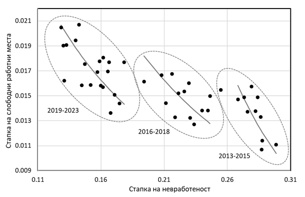 Од графиконот може да се забележи дека се издвојуваат три последователни периоди за кои засебно може да се оцени кривата на Бевериџ. Имено, во текот на набљудуваниот период кривата се поместува налево како резултат на континуираното намалување на невработеноста, но исто така се поместува нагоре што е предизвикано од растечката стапка на слободни работни места кои тешко се пополнуваат. Односот меѓу бројот на невработени и бројот на слободни работни места континуирано се намалува од 50:1 во 2013 година до 10:1 во 2023 година. Овде треба да се истакне дека намалувањето на невработеноста не секогаш се должи на порастот на вработувањето, туку и на други фактори што доведуваат до структурни промени како што се емиграцијата и појавата на обесхрабреност кај долгорочно невработените. Затоа, денес сме соочени со парадоксална состојба каде што и покрај невработеноста на околу 100.000 лица, работодавците се соочуваат со тешкотии да најдат соодветни работници за околу 10.000 слободни работни места.